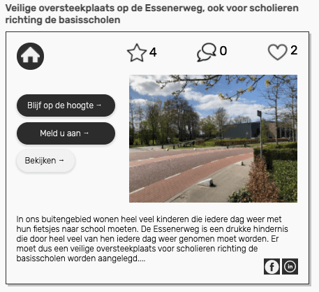 - Voor initiatiefnemers / projectontwikkelaars die onder de omgevingswet moeten kunnen aantonen dat de omwonenden zijn betrokken in ruimtelijke plannen